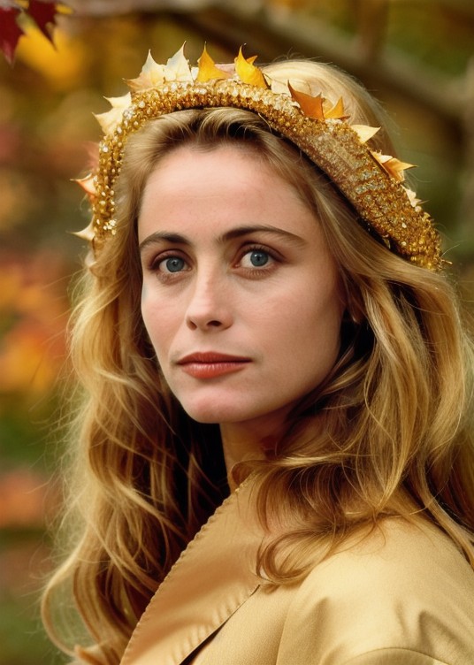 Masterpiece, beautiful emmanuelle_beart, drill hair, wearing gold laced dress, autumn, leaves, trees, best quality, samdoesarts, portrait, intricate detail, relaxing, brown eyes, headdress, detailed eyes, big pupils, brown eyes <lora:emmanuelle_beart-000007:0.7>,