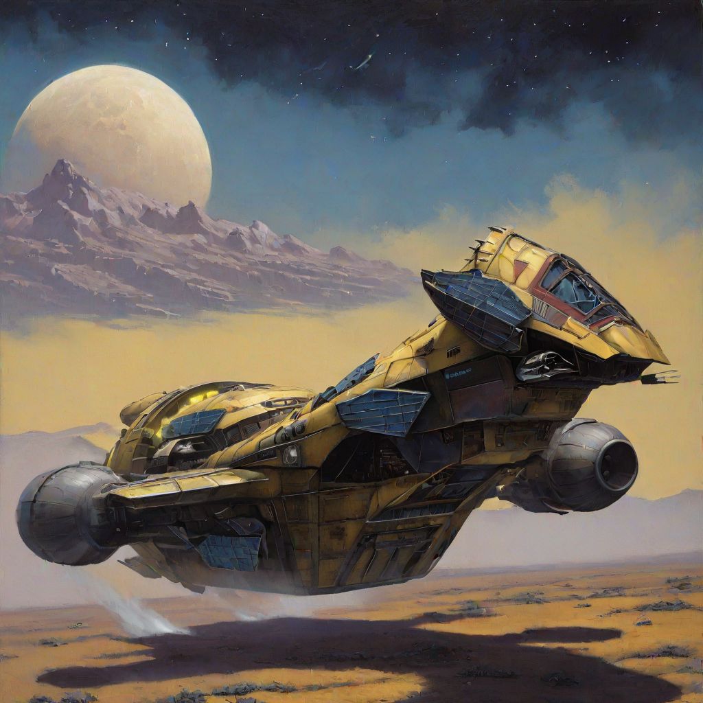 painting, ((clean lines)), <lora:RetroSpaceships:0.8>, ((smooth design)), ((symmetry)), ((sleek design)), ((extrusions)), ((engine exhaust)), ((desaturated)), spaceship, ((blue and yellow hull)), (((flying over lunar landscape))), ((realistic)), (Cinematic anime screencap,limited palette, :1.3), (best quality), (70s style:1.2), 1970, (retro:1.2), dramatic, 8k, deep shadows, photorealistic, no humans,vehicle focus,((limited palette)), flat color, (oil painting:1.16),(acrylic paint:1.16),((retrofuturism)),(science fiction), by ((Chris Foss)), ((Bruce Pennington))