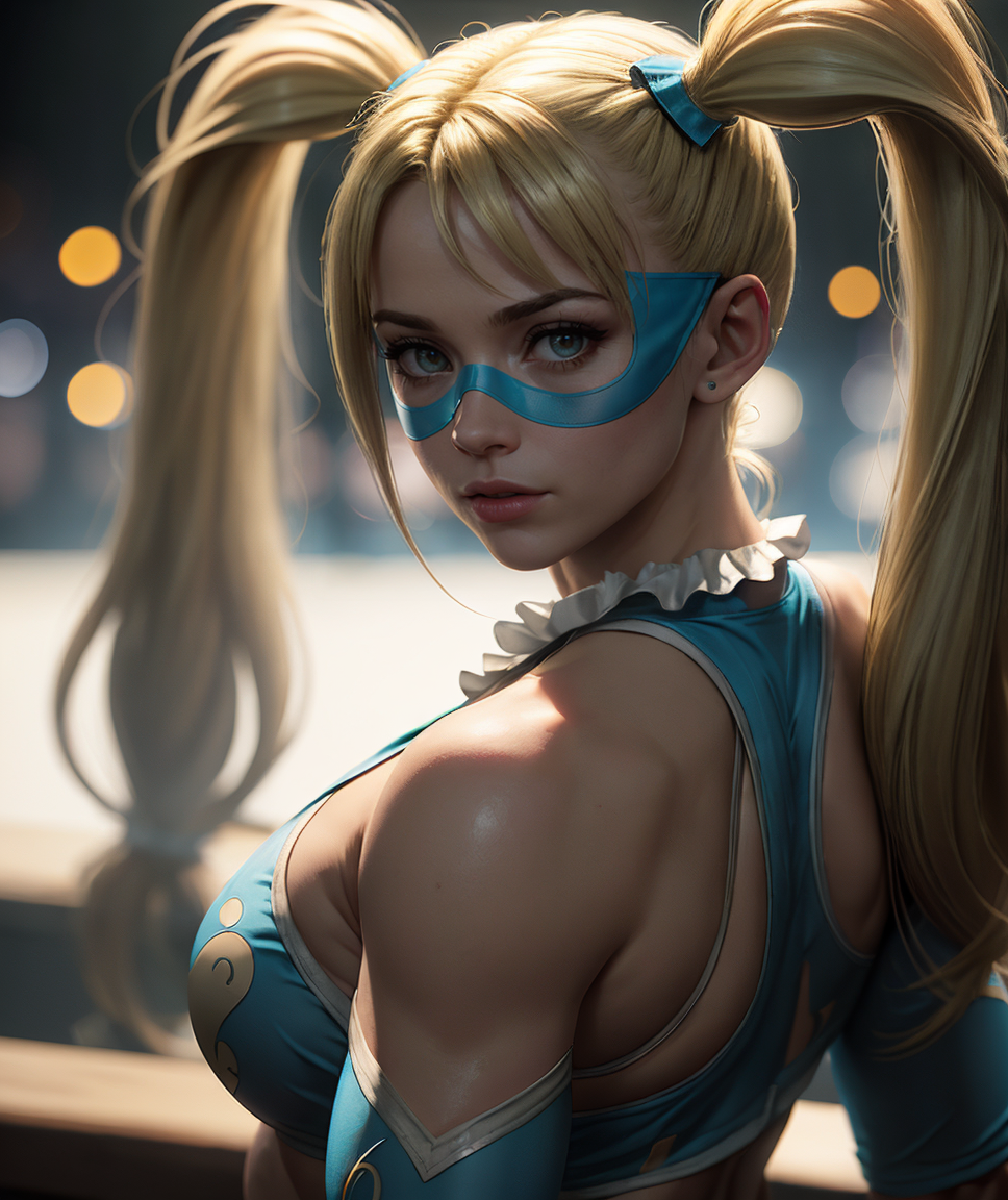 cinematic film still <lora:quiron_RainbowMika_v1_Lora:0.77> RainbowMikaQuiron , rainbowmika, 1girl, domino mask, long hair, blonde hair, twintails, pointing, best quality, . shallow depth of field, vignette, highly detailed, high budget Hollywood movie, bokeh, cinemascope, moody, epic, gorgeous, film grain, grainy