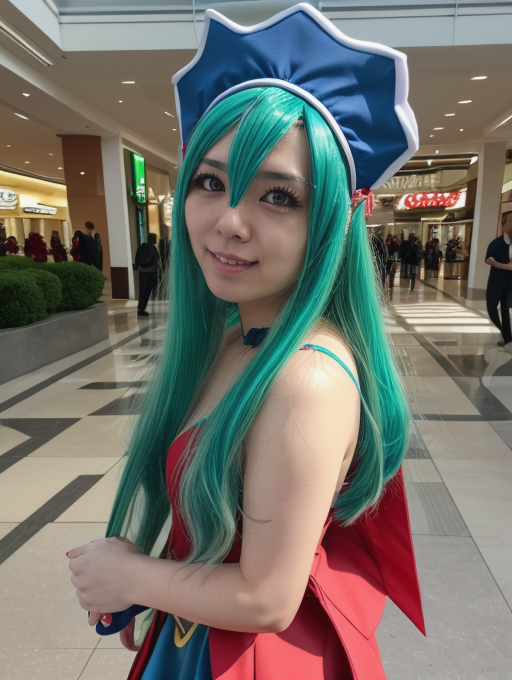best quality, masterpiece, highres, detailed, realistic, <lora:Detail - add_detail:0.2>, Mariandale, <lora:Mariandale-10:0.9>, mall, cosplay, japanese woman, wig, posing, happy, blue and red dress, green hair, headdress, upper body,