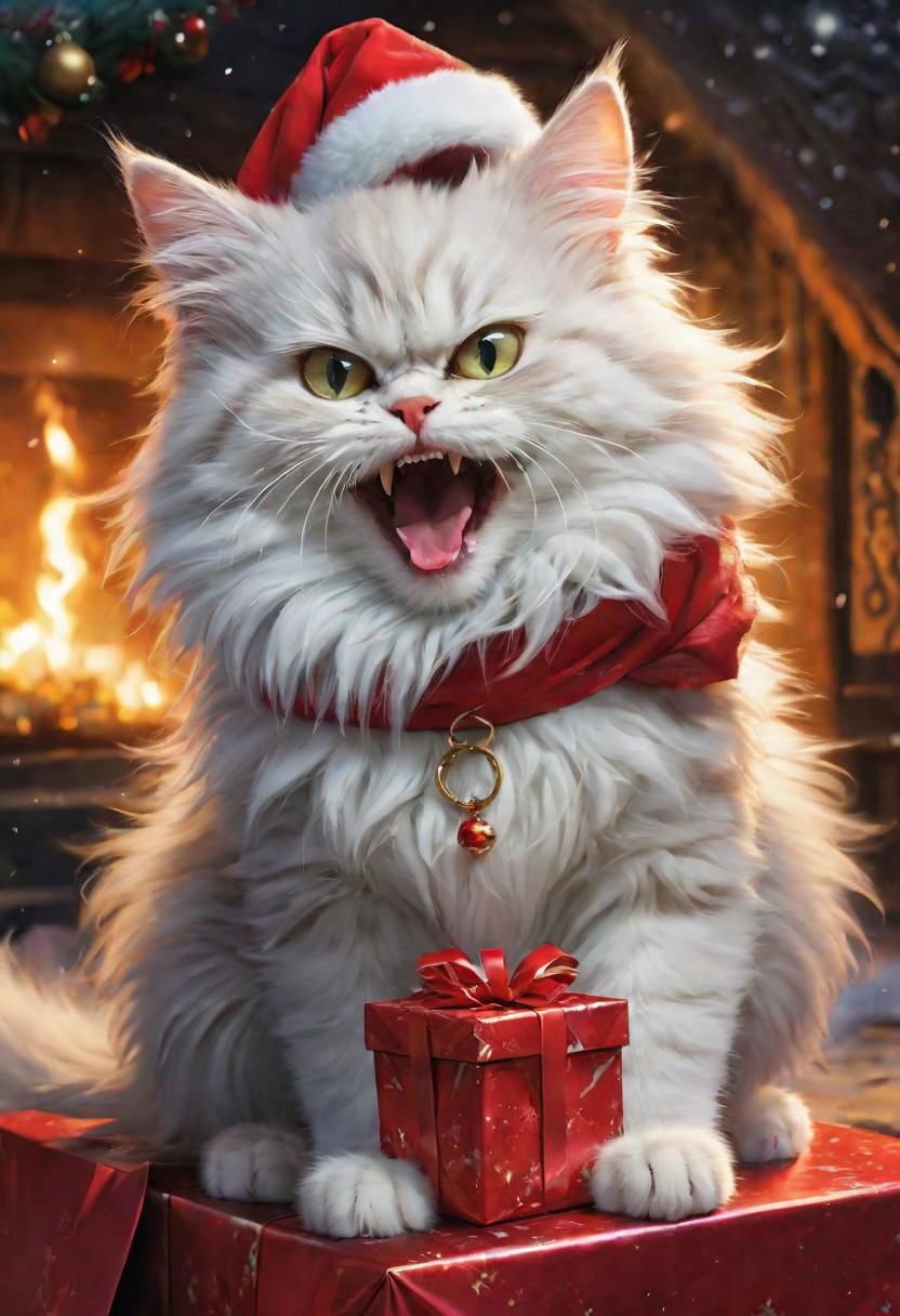 unique realistic (fluffy angry kitten:1.8) (bursting free of a wrapped Christmas gift:1.8), (Angry and hissing:1.2), BREAK, A (Shocked women holding the gift:1.8), a phantasmagoria, Egyptian Night Atmosphere, Dynamic Angle, Dramatic Lighting, desert winter masterpiece, digital painting,<lora:add-detail-xl:1.4>, windy epic polar, ,(luminous cat eye),professional make-up, mesmerize