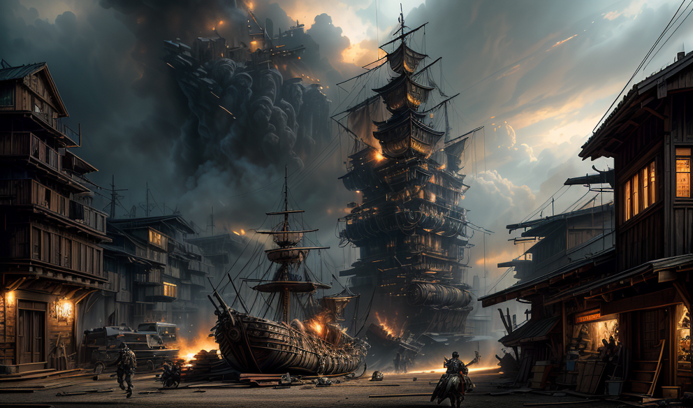photorealistic, a photo a makeshift flying pirate skiff with jets engines through mountains and clouds, dog fighting, tracer rounds, explosions, (background upper left side is a grand floating city:1.2), cobbled together, rusted, tattered rags, ramshackle, wood haul, metal, spikes, chains, plates, harpoons, spikes, (perfect composition:1.4), 4k ultrarealistic, cinematic lightening, (glowing lights), high fantasy background, action pose, By jeremy mann, by sandra chevrier, by maciej kuciara, sharp, ((analog)), (highest quality, Alessandro Casagrande, Greg Rutkowski, Sally Mann, concept art, 4k), <lora:more_details:.8>, <lora:wowifierV3:.8>