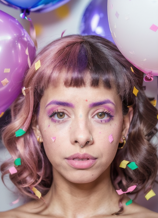 portrait of sks woman on the birthday party, epic, no makeup, (photo, studio lighting, hard light, sony a7, 50 mm, matte skin, pores, colors, hyperdetailed, hyperrealistic), ((balloons, confetti)), <lora:locon_melaniemartinez_v1_from_v1_64_32:1>