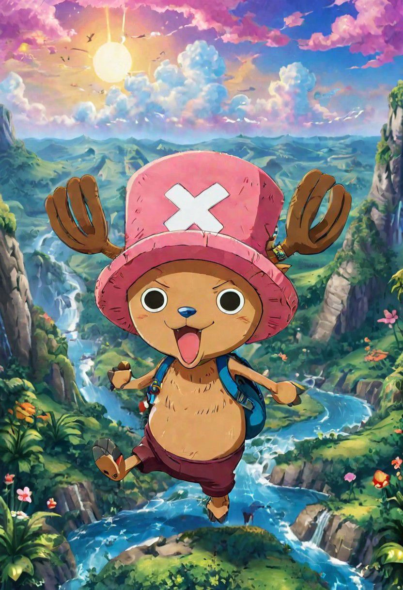 action frame, a Tony Tony Chopper embarking on an adventurous journey through a fantasy world, adventurous, magical, vibrant, dynamic, fantastical, enhancing the magical elements of the scene, vast and enchanting landscapes of the fantasy world, dawn, with the soft light of the rising sun illuminating the fantastical creatures and landscapes, vibrant colors and whimsical characters defining the scene, mythical creatures and magical landscapes creating a sense of wonder, Serious