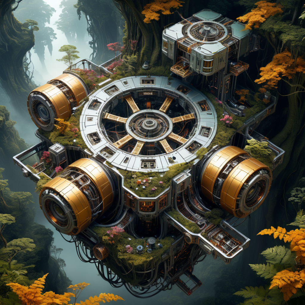 Biomorphic stunning abondend space station ruin in forest biomechanical interface maximalist perfect illustration, digital painting art, scifi, futuristic, utopian, machine parts, body parts, wires, circuits, highly detailed, floral, octane render, cinematic, aerial look from above, hauntingly surreal, highly detailed and intricate, rich deep colors, intricate artwork masterpiece, ominous, matte painting movie poster, golden ratio, intricate, epic, artistic masterwork by head of prompt engineering <lora:xl_more_art-full_v1:0.5> <lora:add-detail-xl:2>