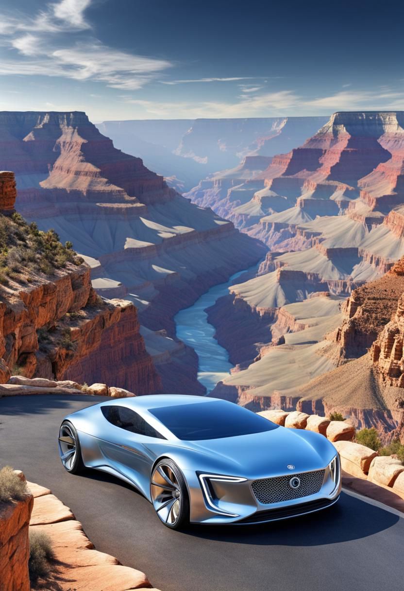 (masterpiece), A Golf as futuristic car, Highly detailed background of the Grand Canyon, HDR, hyper realistic, symetric,