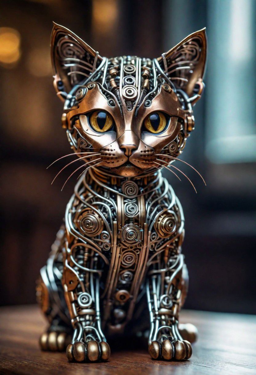 a cute kitten made out of metal, (cyborg:1.1), ([tail | detailed wire]:1.3), (intricate details), hdr, (intricate details, hyperdetailed:1.2), cinematic shot, vignette, centered