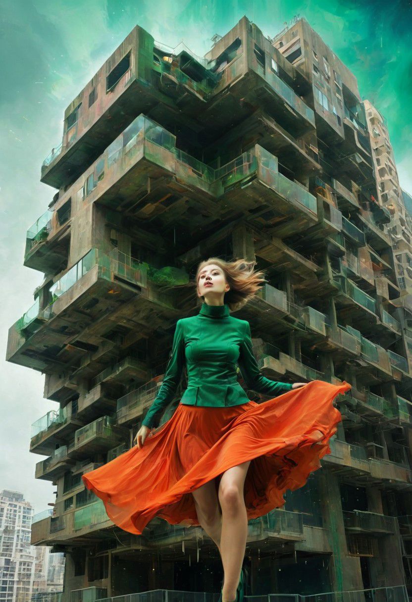 by Dom Qwek and Denys Lasdun, (magnificent , Abstract Expressionism but extremely beautiful:1.4), (intricate details, masterpiece, best quality:1.4) , view from below, woman with flowing skirts flying between buildings, levitating, clothes like midnight full of stars, Cyberpunk style, neon, dystopian, futuristic, digital, vibrant, detailed, high contrast, reminiscent of cyberpunk genre, , looking at viewer, dynamic pose, red and petrol green hue <lora:add-detail-xl:1> <lora:xl_more_art-full_v1:0.5> <lora:NicolaSamori:0.5> in the style of nicola samori <lora:looking_at_viewer:2>