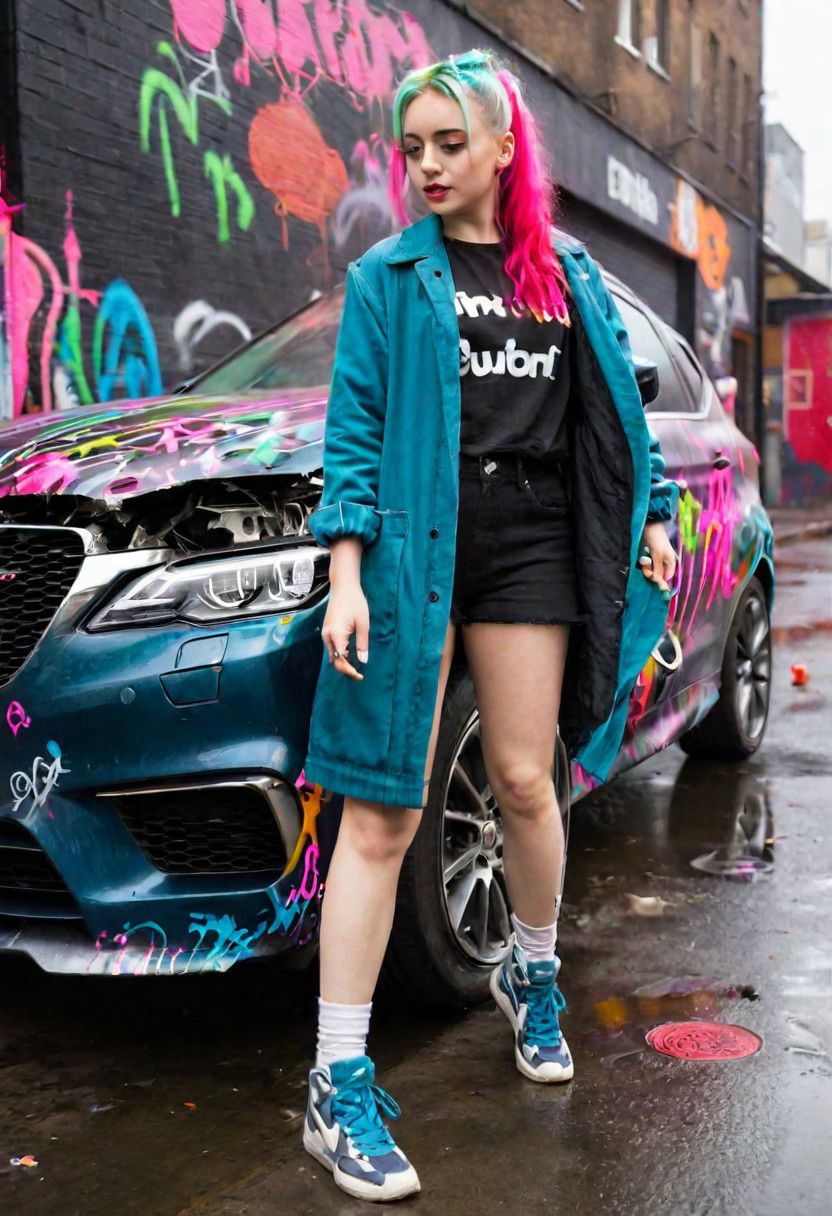 <lora:badquality_v02:1>, ((deep focus, crisp focus, digital sharpening:2, jpg, grainy snapchat still, instagram post, blurry, motionblur, flat light , haze, blur , out of focus, slow shutter, high ISO)) cute punk girl , next to car covered in graffiti, spraypaint can, busy crowded street night, natural light, topless
