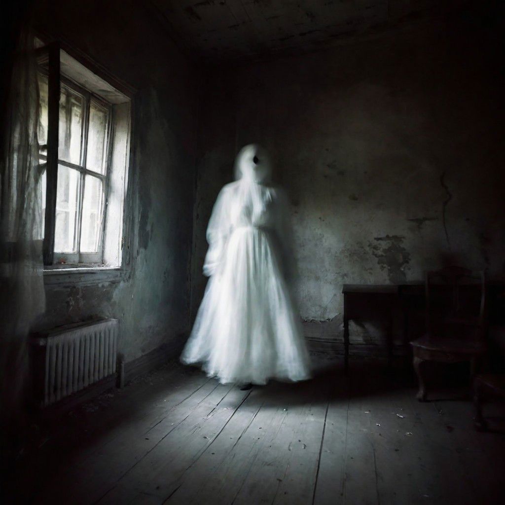 In a weathered apartment, the air is heavy with silence. Moonlight seeps through cracked windows, casting feeble rays upon desolation. Each step on creaking floorboards reverberates through the neglect-laden space. Shattered furniture, draped in dusty sheets, stands like ghosts frozen in time, and fractured mirrors distort reality. A spectral whisper rustles through tattered curtains, revealing the apartment's untold stories. Suddenly, the air chills, and in a corner, a female ghost materializes. Her translucent form hovers, tattered garments swaying like ethereal tendrils. Hollow eyes fixate on you with an unsettling gaze. As the ghost hovers, a chilling aura distorts the air, sending shivers through your spine. Oppressive silence is pierced by spectral moans, an unseen presence transforming the apartment into a gateway to the supernatural. Irregular floorboard creaks respond to an otherworldly force. Shadows dance as the ghost moves through dimly lit space, once-familiar surroundings twisting into a nightmarish dreamscape. Flickering light plays tricks, casting eerie reflections. The ghost's hovering figure defies the physical realm, creating uncanny unease. Spectral moans envelop the apartment in a haunting symphony. In this spooky scene, the dilapidated apartment becomes a canvas for the supernatural. Dilapidation, chilling atmosphere, and the hovering female ghost merge, leaving an indelible mark of fear and unease.
