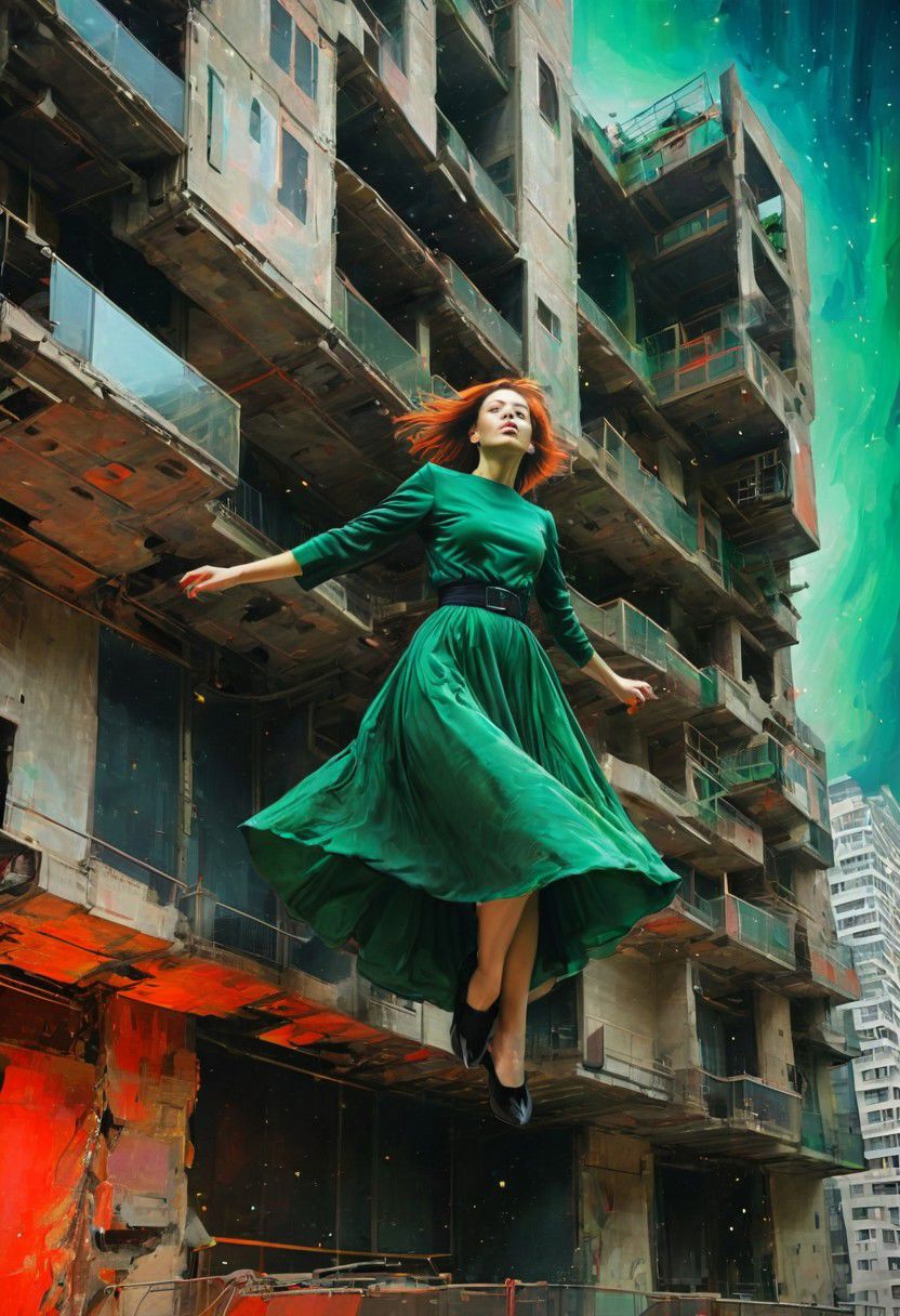by Dom Qwek and Denys Lasdun, (magnificent , Abstract Expressionism but extremely beautiful:1.4), (intricate details, masterpiece, best quality:1.4) , view from below, woman with flowing skirts flying between buildings, levitating, clothes like midnight full of stars, Cyberpunk style, neon, dystopian, futuristic, digital, vibrant, detailed, high contrast, reminiscent of cyberpunk genre, , looking at viewer, dynamic pose, red and petrol green hue <lora:add-detail-xl:1> <lora:xl_more_art-full_v1:0.5> <lora:NicolaSamori:0.5> in the style of nicola samori <lora:looking_at_viewer:2>