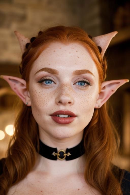 a close up photo of a 18 year old ginger elf woman, cleavage, choker, seductive smile, big mouth, long black hair, dimples, very many ((freckles)) , big ice blue eyes, bright eyes, round face, popping eyes, petite, very large lips, ((full lips)), huge lip, big lip volume, charismatic, medieval bakery, cinematic light, film still, vampire fangs, long fangs, showing off teeth, bleaking fangs, pointy ears, elf ears