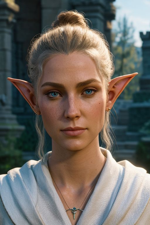 a (Elf (Shadowheart)) in an action pose BREAK wearing white silk robes casting a light spell BREAK outside a bright castle with marble walls and statues at sunrise BREAK BG3, skin pores, intricate details, very detailed face