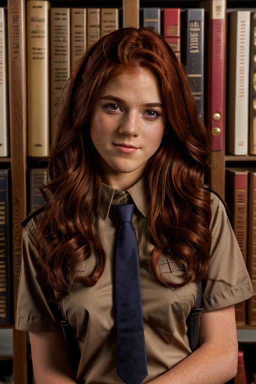 school girl costume , library , dusk <lora:Rose_Leslie:1> masterpiece, best quality, detailed face, a mature r1873l, 1girl, solo, red hair,