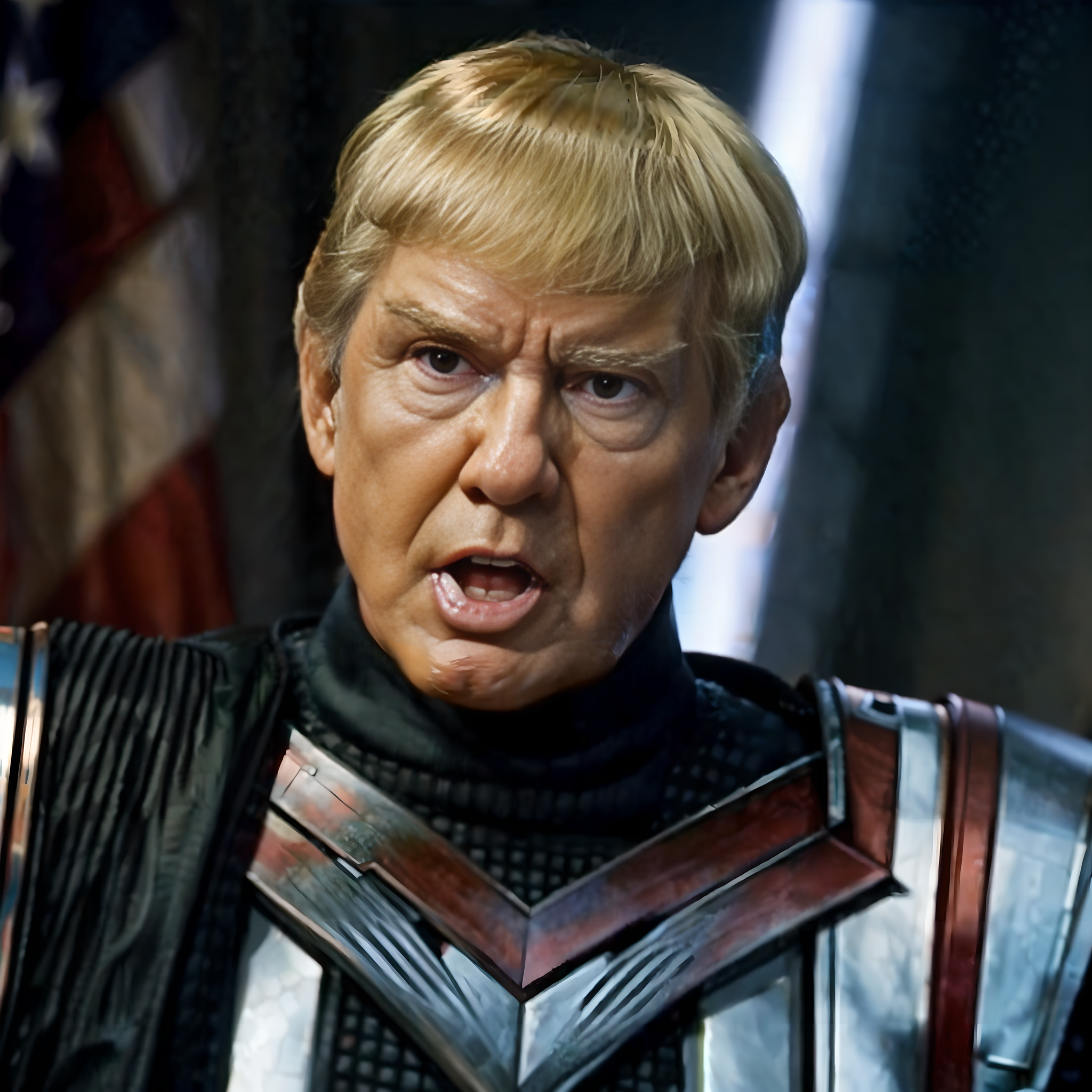 Donald Trump as a Romulan <lora:race_st_romulan:.69> with (pointy ears) and (pointy eyebrows) and (forehead ridge) wearing armor, angry, (blonde) hair, teeth