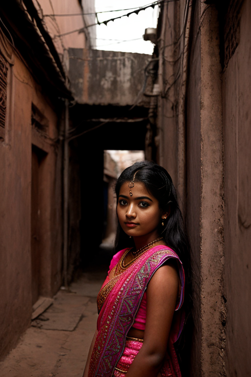 Indian girl, 18 years old, (looking at camera), curious, vibrant, in a dimly lit alleyway, perfect composition, hyper realistic, <lora:OneBreastOutLoRA_V1_1rank8:1>
