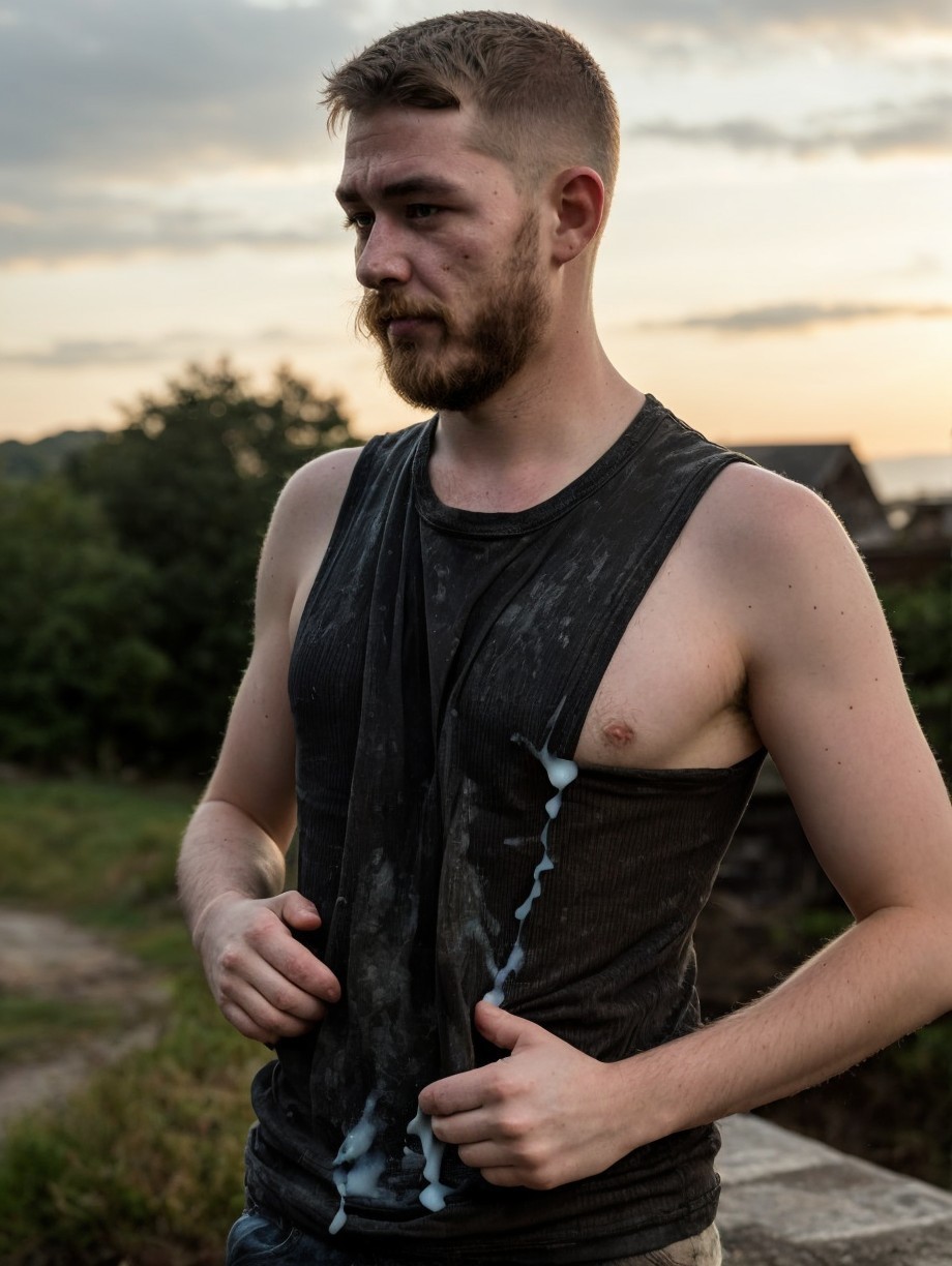 <lora:gender_slider_v1:-3> <lora:zoom_slider_v1:-4.5> <lora:cumrag:1.2> <lora:shirtsqueeze_sd15:0.75> <lora:hair_length_slider_v1:-4> (cumrag shirt:1.3), (far away shot:1.1), (face:1.3), photo of a Irish age 18 (man:1.5) wearing a (black tank top:1.1) shirt, (ribbed cotton:1.1), hairy chest, hairy armpit, (shirtsqueeze:1.3), (hand on chest:1.3), (wet:0.5) cum stains, dirty, (sweaty:0.2), (crusty:0.5) (yellowish:0.7) (whitish:1.3) (dry stains:0.6), goo, stinky, gross, sticky, nasty, natural lighting, 4k uhd, dslr, soft lighting, high quality, Fujifilm XT3, red soft natural light