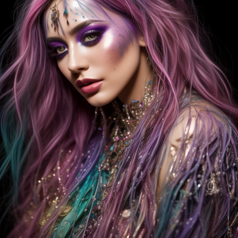 An enchanting and vibrant close up portrait of a female model with purple hair, adorned with streaks of bold and contrasting pink and blue paint. She wears a captivating green dress, intricately designed with delicate details. Her face is clear and radiates a subtle glow, with vivid purple eyes that add a mesmerizing charm to her appearance. The background showcases a blurry cityscape, creating a dynamic backdrop that complements the model's elegance. The epic character composition, combined with sharp focus and natural lighting, brings the captivating image to life. The subsurface scattering effect adds a touch of ethereal glow, while the f2 aperture and 35mm lens create a perfect balance of depth and detail. <lora:PaintSplashV1:0.7> 11paint65splash99