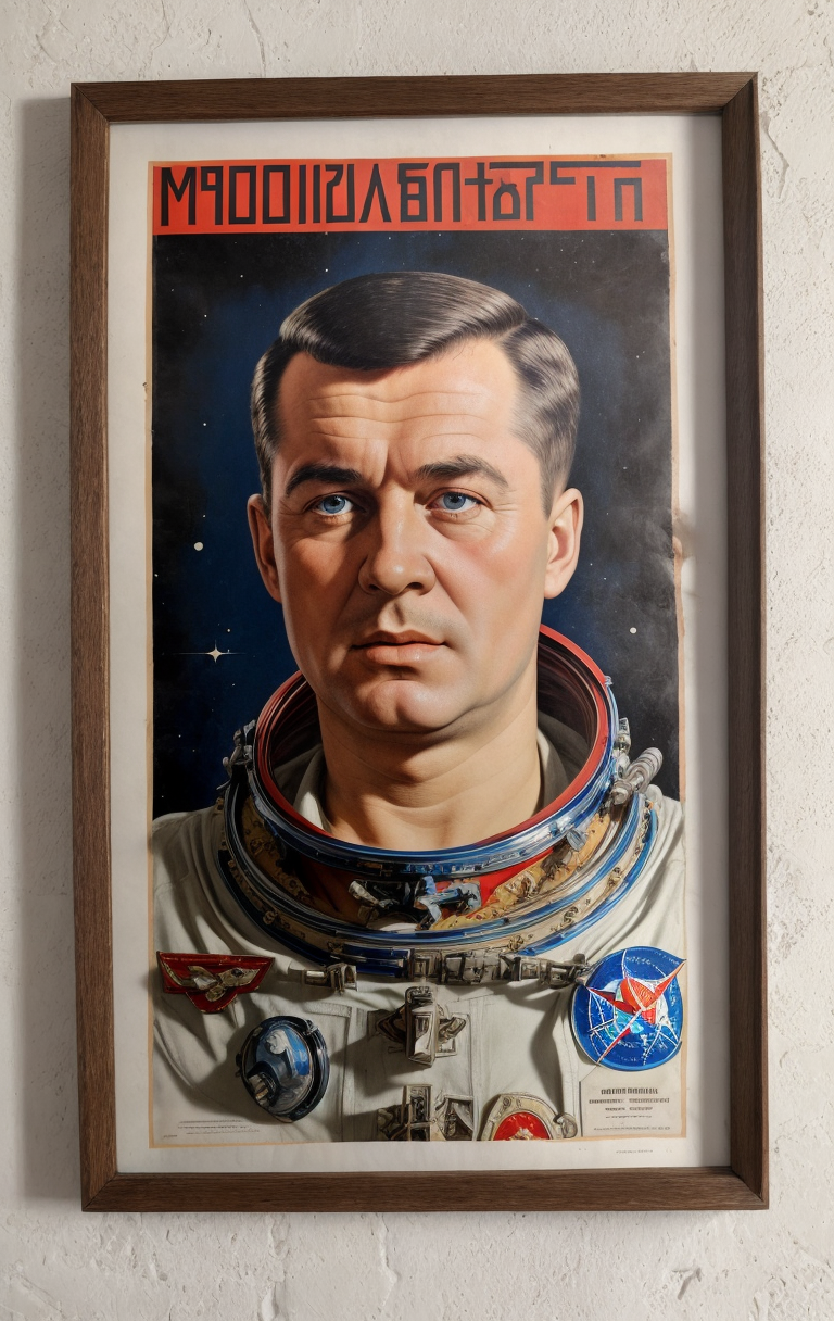 (masterpiece)+, (best quality)+, (Intricate detail)+, 1960's russian cosmonaut headshot propaganda poster, done in soviet style, slightly faded, on a dusty wall
