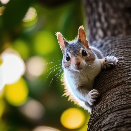 A photo of a cute hybrid of squirell and cat jumping on the tree, god light, bold natural colors, wide angle view, masterpiece, trending on artstation, photograph, award-winning, documentary, wildlife, 8k