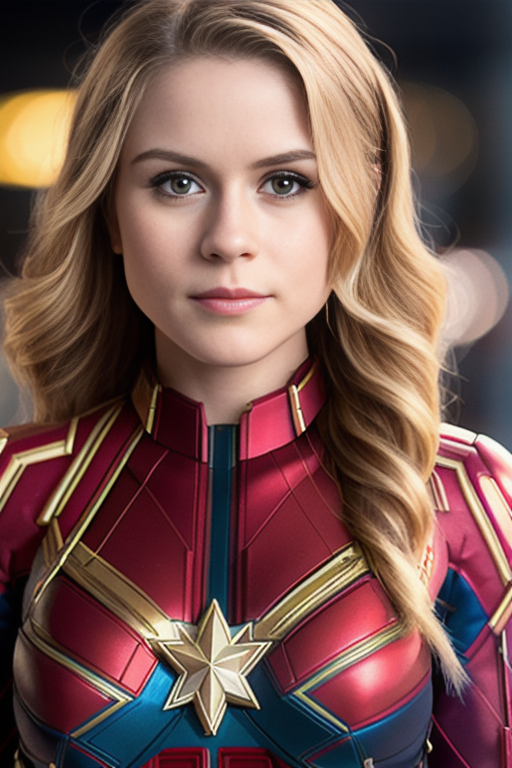 photo of a 3r1nM0r1art72, 3/4 shot,Captain Marvel Costume, detailed face, intricate, elegant, sharp focus, photo by, soft lighting, bokeh blur, vibrant colors, masterpiece, detailed face, beautiful ,