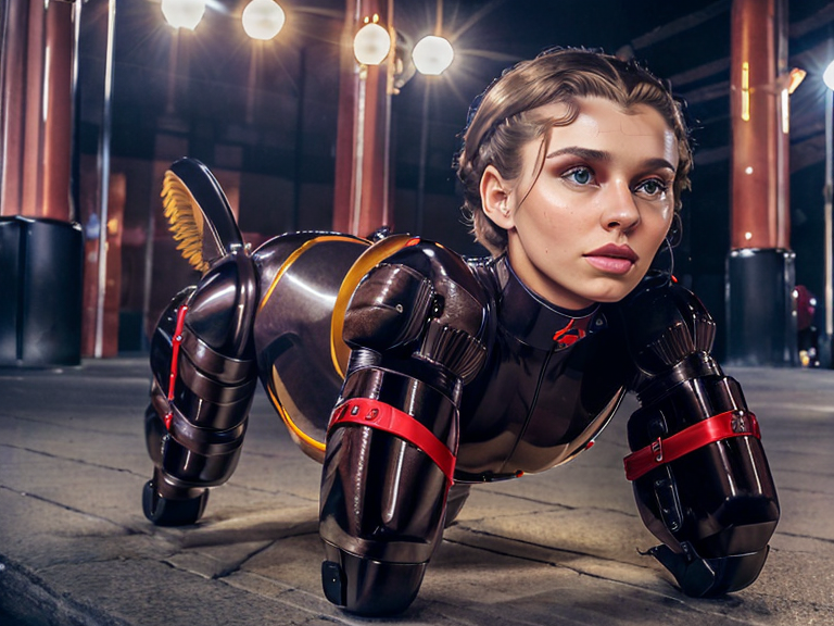 (wholebody) photo of a beautiful Russian woman, bitchsuit:2.5, four feet, all fours, age: 20 years old, build: lush, face: symmetrical and beautiful and puffy cheeks, hairstyle: russet and short bob, (high quality, 8k, masterpiece, highly detailed, highly detailed face), <lora:bitchsuit:0.9> prosthetic quadruped, robot joints,
