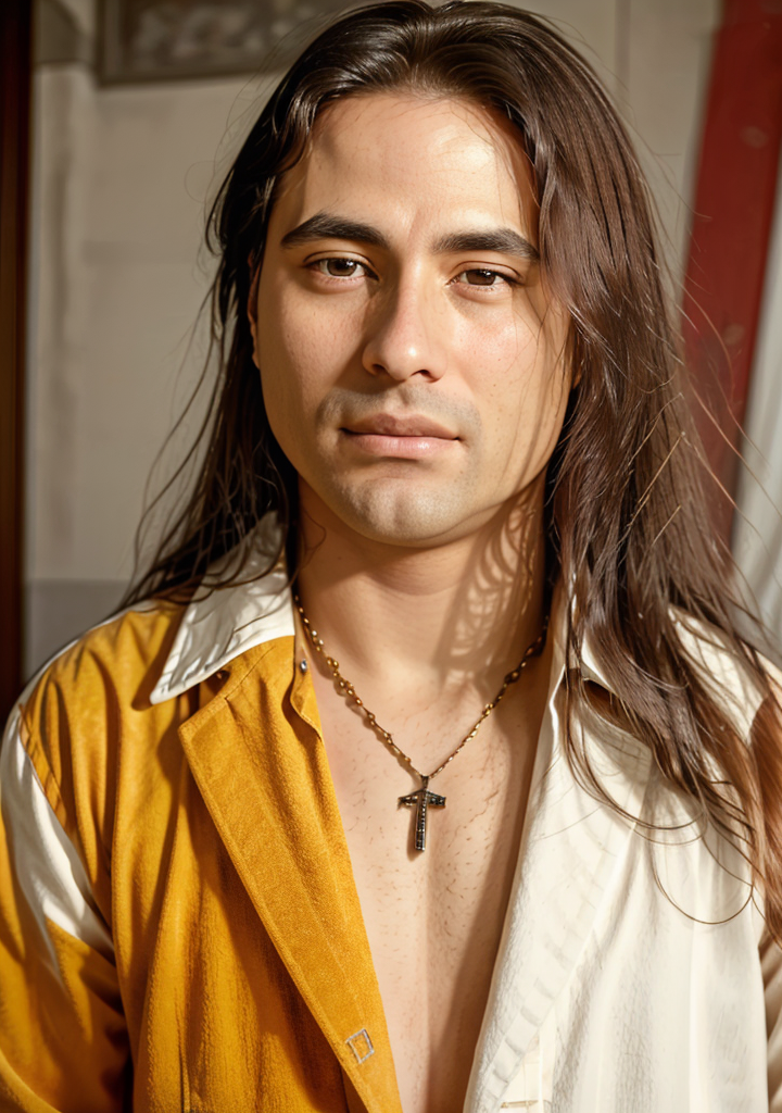 AndreMatosQuiron person, perfect body, wearing a unique blend of majesty, exceptional attention to detail, luxurious fibers, a vibrant color palette of yellows, and rich, red oranges, inside winter cottage house, (look at viewer:1.1), (high quality face:1.1), (high detailed face skin:1.1), (realistic lighting:1.3), (beautiful moles and freckles:0.2), (film noise:1.4), (film grain:1.4), cinematic, realistic skin, <lyco:quiron_AndreMatos_v3_lycoris:0.8>