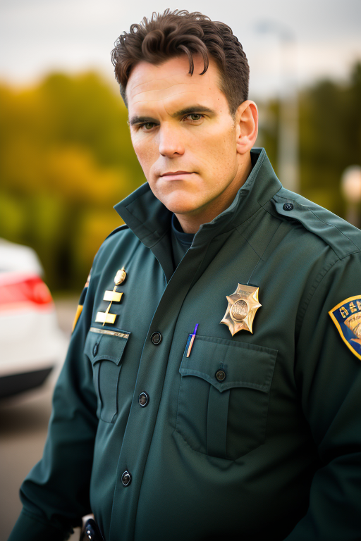 raw photo of a handsome man, looking at the camera, police officer, police cruiser in the background, midnight, close up, 8k uhd, fujifilm xt3
