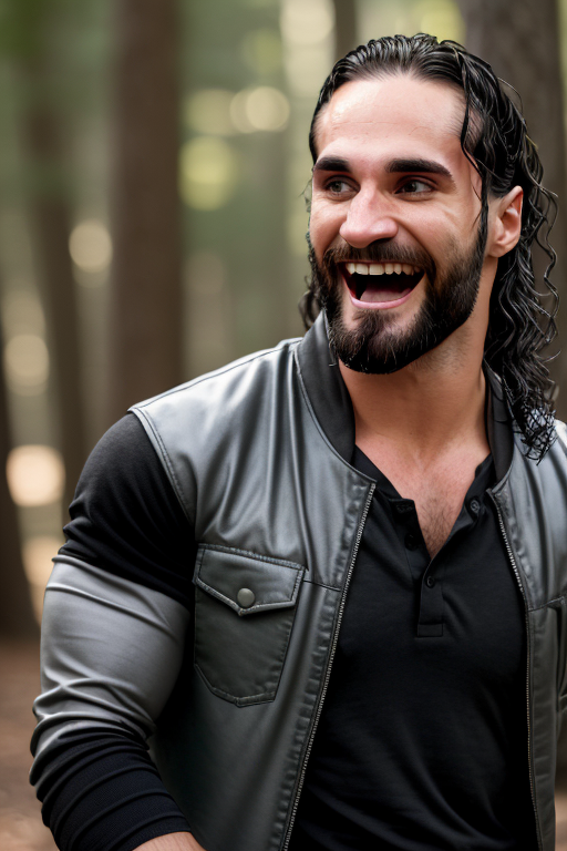 portrait of seth rollins, (laughing:0.8), full clothes, shirt, casual, in a forest, sunlight, warm colors, natural lighting, bokeh, bloom, light particle, <lora:Nlo_SethRollins_v1:1>