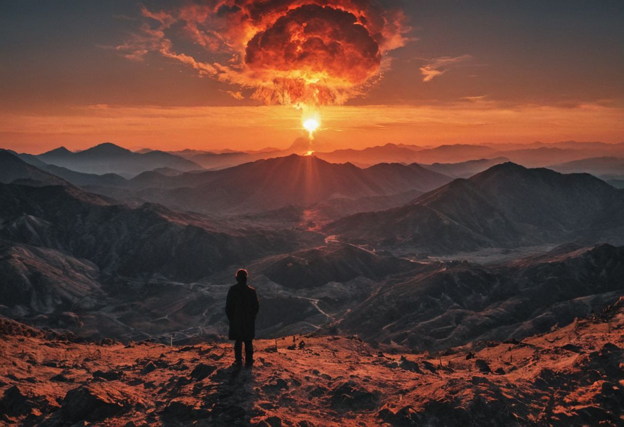 (nuclear waste:2), (nuclear explosion on in background:3), red sun dawn behind mountains, (dark silhouette of person on the sky looking down on the sky:2), extremely detailed, (highly detailed:3), (etching:3), (max screck), B&W