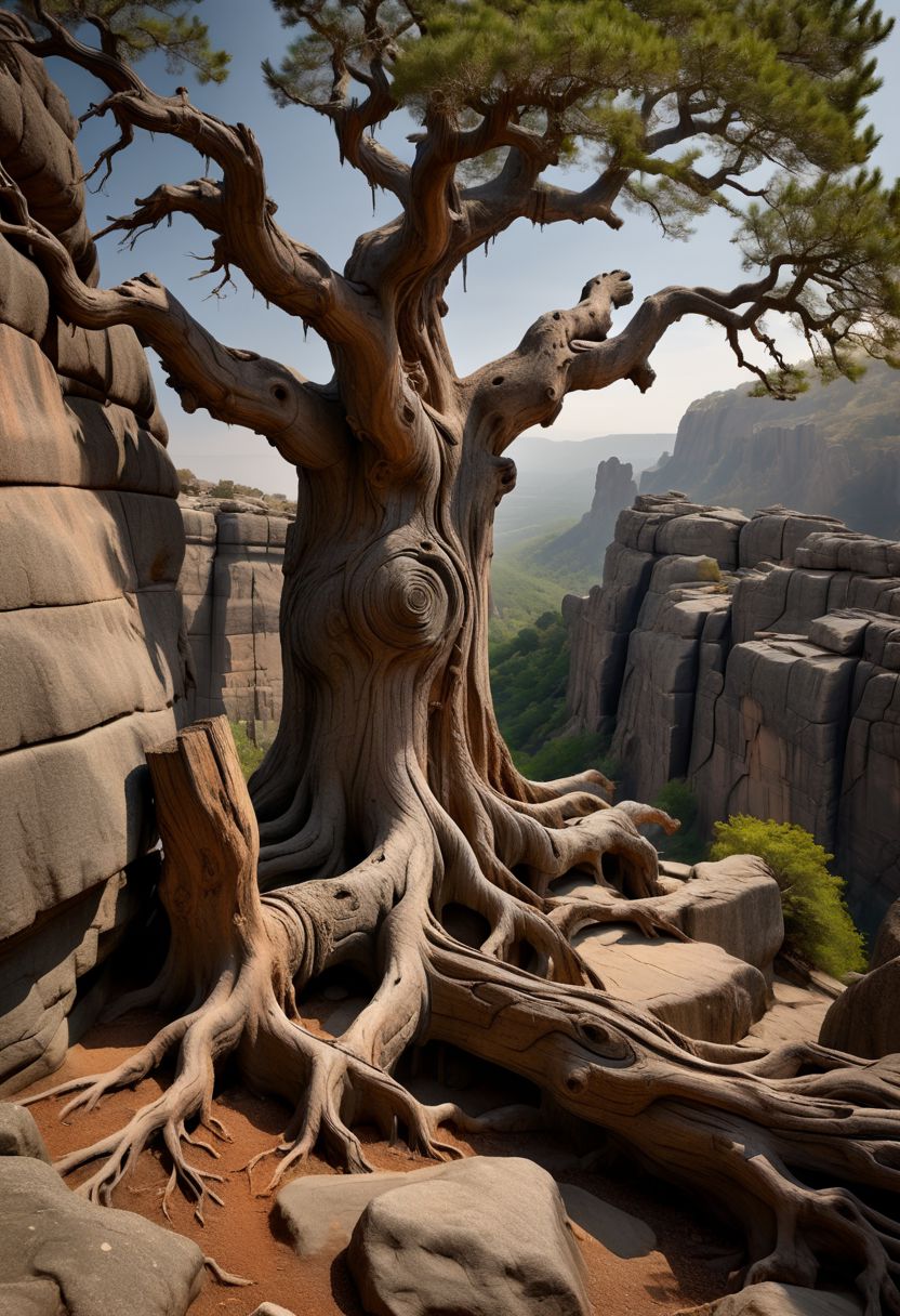 beautiful shot of an huge, gnarled, and ancient tree with exposed roots over a granite cliff, climbing on it, 100mm f/2.8 macro lens, depth of field