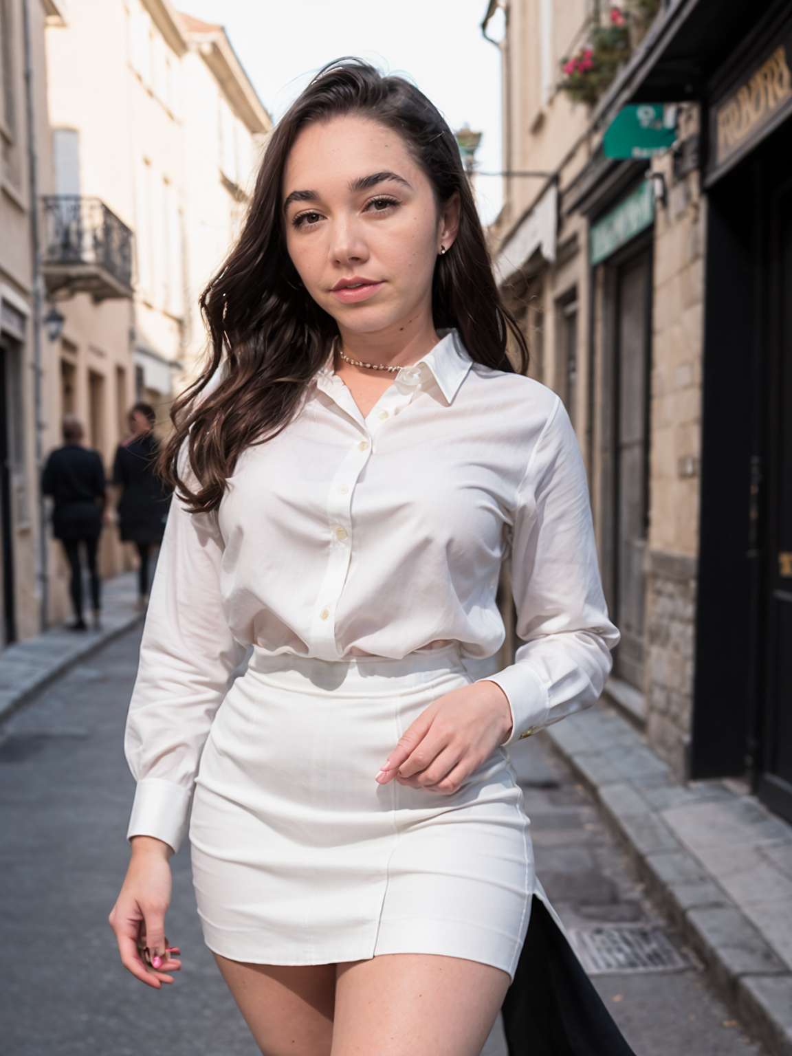 RAW photo of the gorgeous kargrey walking through a french village street, long black hair, (wearing white blouse and a black skirt:1.2), soft lighting, film grain, Fujifilm XT3