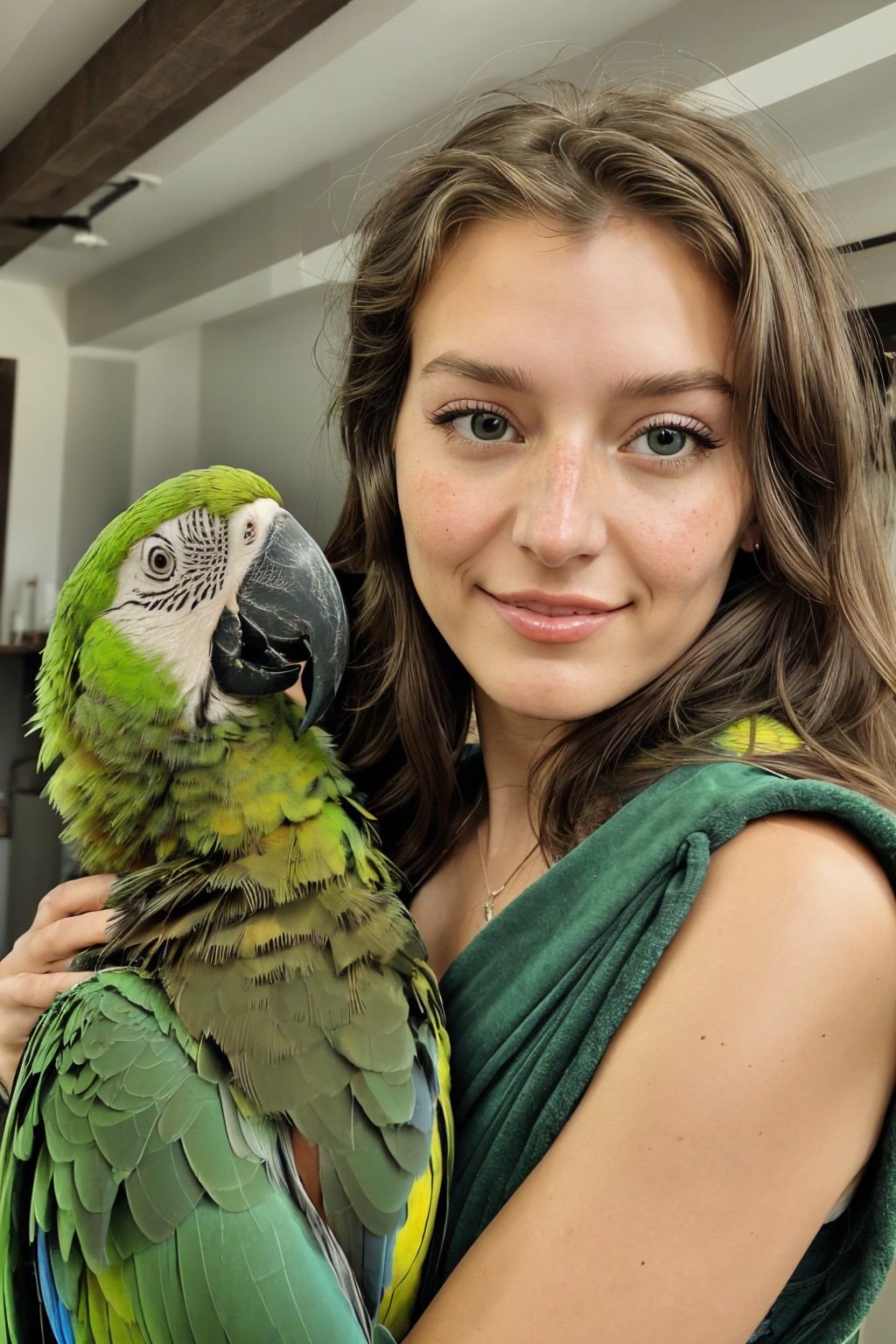 photo of <lora:sd15_JessicaClements_v1:.9> JessicaClements with a green parrot on her shoulder