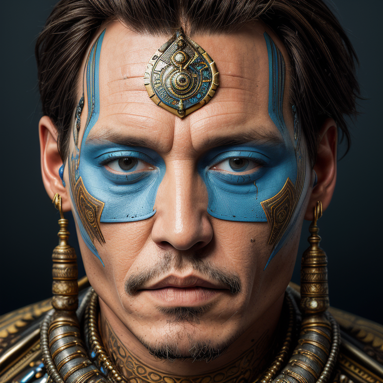 portrait of johnny depp, head, tribal, blue and gold, naki <lora:Naki:0.45>