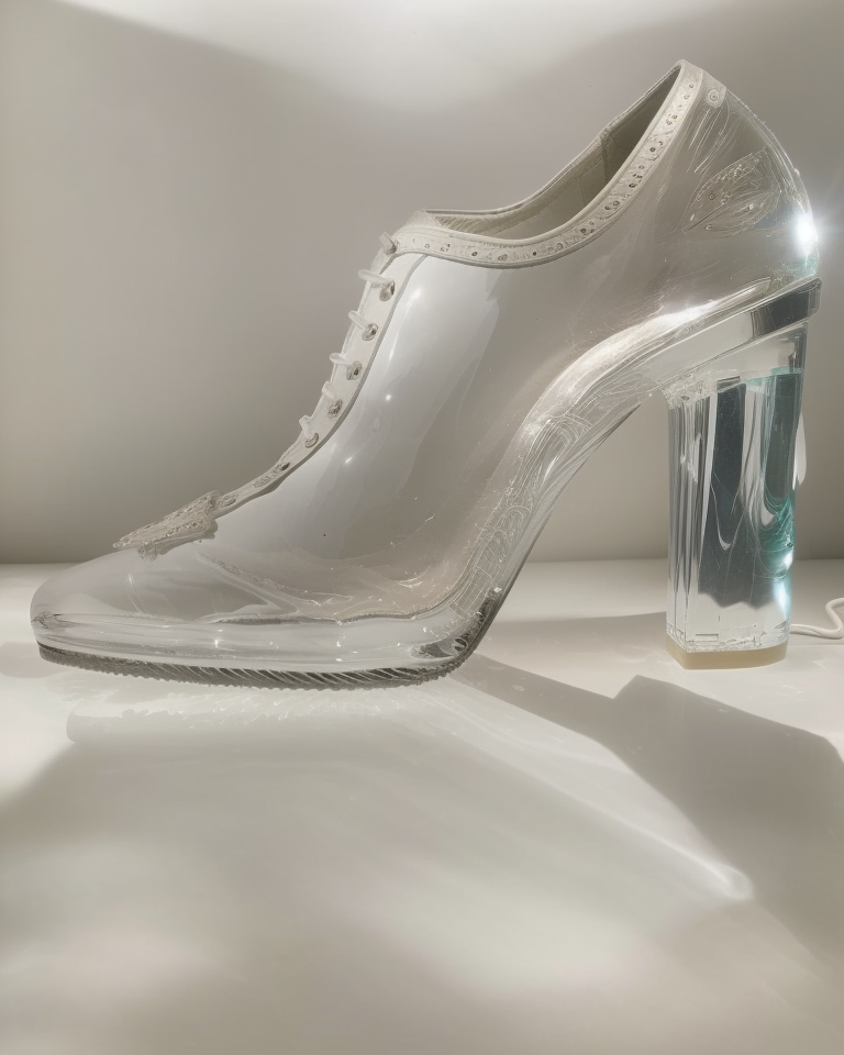 epic shot of a oxford brogue formal shoe made of white (transparent glass) <lora:glasssculpture_v8:1> transparent glass, studio lighting, cinematic glass slipper