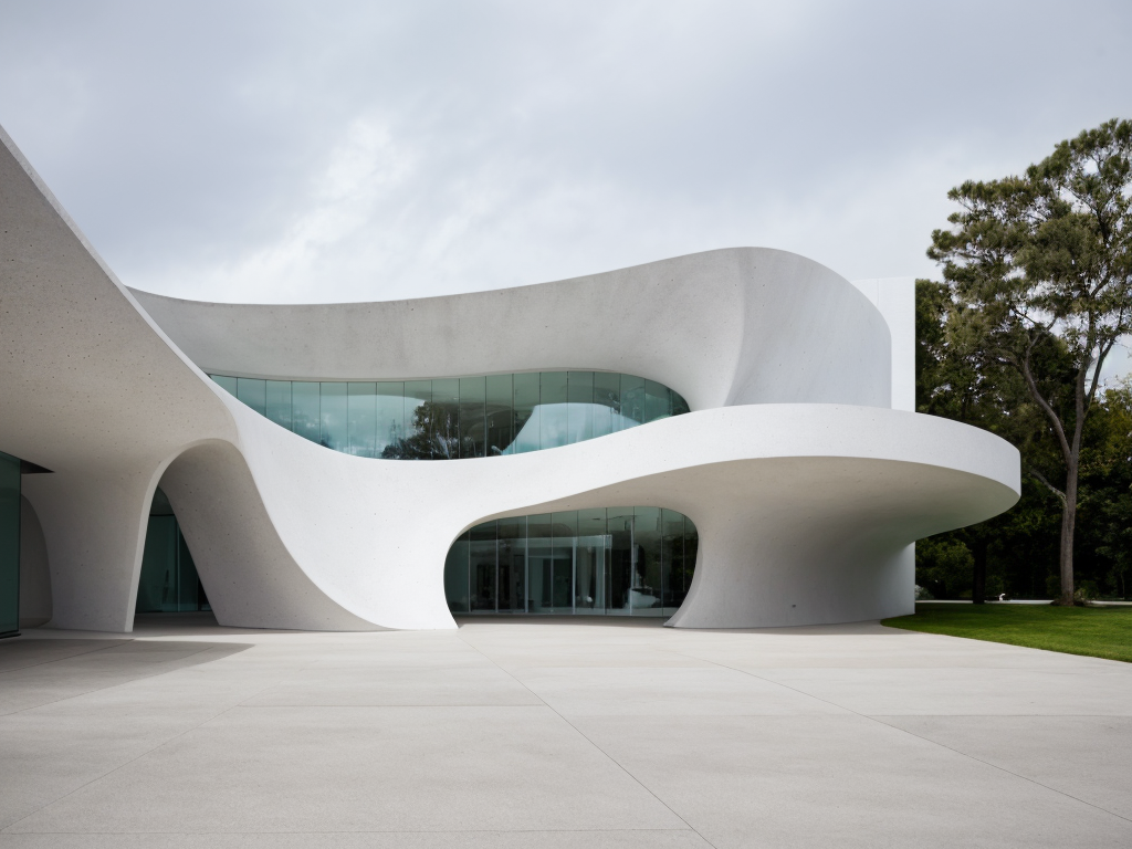 <lora:Arc_v5:0.6>, RAW photo, (masterpiece building from outside), frontal elevation, curvilinear, white sky, cinematic lighting, (diffused light:1), white concrete, contemporary brutalism style, architectural expressionism, fog, (warm interior light:1), (open plaza), architecture photography, hyper realistic, super detailed, 8k, Nikon Z6 Mirrorless Camera, film grain
