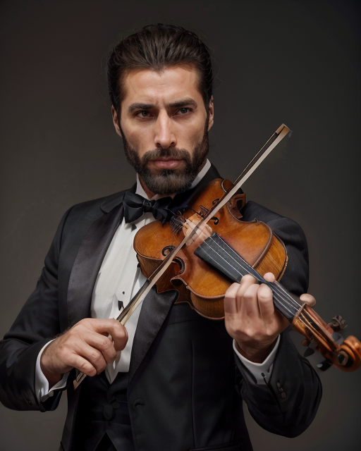 (playing violin) cinematic side portrait of (gigachad) man wearing black tuxedo <lora:Gigachadv1:.65> <lora:violin_v15:.55>