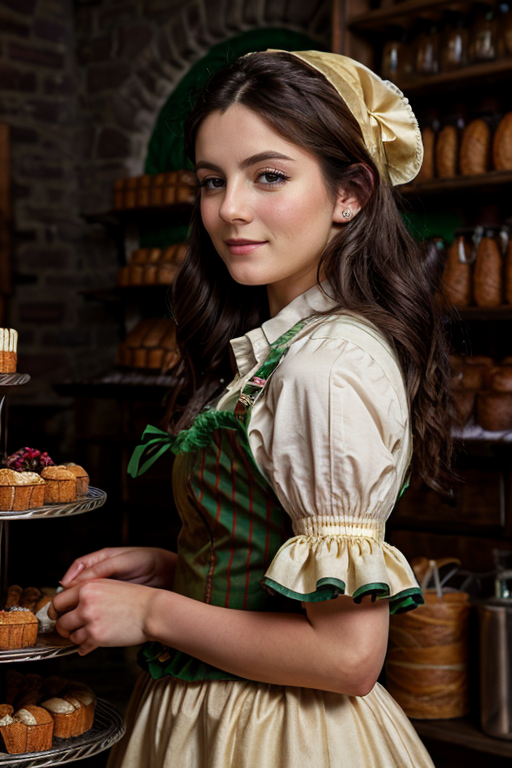 irish costume , bakery , day <lora:Monica1873Barbaro:1> masterpiece, best quality, detailed face, 1girl, solo, a woman, m1873b,