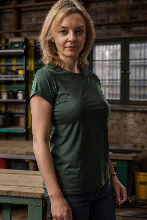 a mature L1873T Jade Green tshirt, garage, leaning on a workbench <lora:Liz_Truss2:1> masterpiece, best quality, detailed face,, 1girl, solo, l1873t, realistic, blonde,