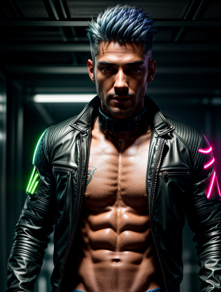 full body portrait of a photorealistic handsome cyberpunk guy, with silver hair, six-pack abs, strong, neon lighting, cybernetic tech implants, black leather glowing tech jacket with neon collar, glowing (((tattoos))), ripped leather pants, detailed face, full body, fog, smokey neon tech cyberpunk bar, (best quality, masterpiece)), dramatic camera shot, RAW footage, 8K, diffuse lighting, raytraced light, speckle highlights, ambient light, absurd res, (extremely detailed:1.3), highest res, color grading, focused, color correction, masterpiece, best quality, 8k, ((wide angle)), HDR, bloom, Photorealistic, dramatic, (Insane skin detail), (photorealistic skin:1.2), (high skin detail:1.2), extremely detailed, Intricate, High Detail, ((full body, head to boots)), <lora:more_details:1.5> <lora:wowifierV3:.6>