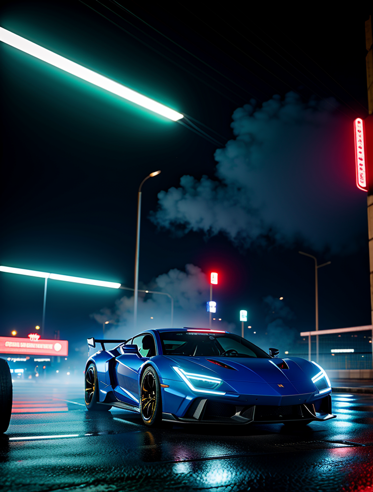 cyberpunk 2077 supercar, blue, in cyberpunk 2077 city photoshoot, running at high speed, glowing lights, speed sensation, well framed at middle range, neon colored luxury rims, slammed, extreme detail, illegal race car, extreme photorealistic, 3D, 8k, Hyper detailed car, perfect soft lighting, great lighting, car photography, fisheye lens, raining, reflection, octane render, high quality, fog, smoke