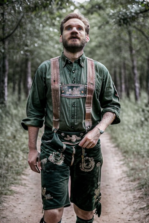 cinematic photo, PewDiePie wearing a lederhosen and crosspiece with Moss green colored shirt , in Dry Savanna Forest, 35mm photograph, film, bokeh, professional, 4k, highly detailed <lora:Lederhosen-v1:.9> <lora:epiCRealismHelper:.7> <lora:PewDiePie_vng:1>
