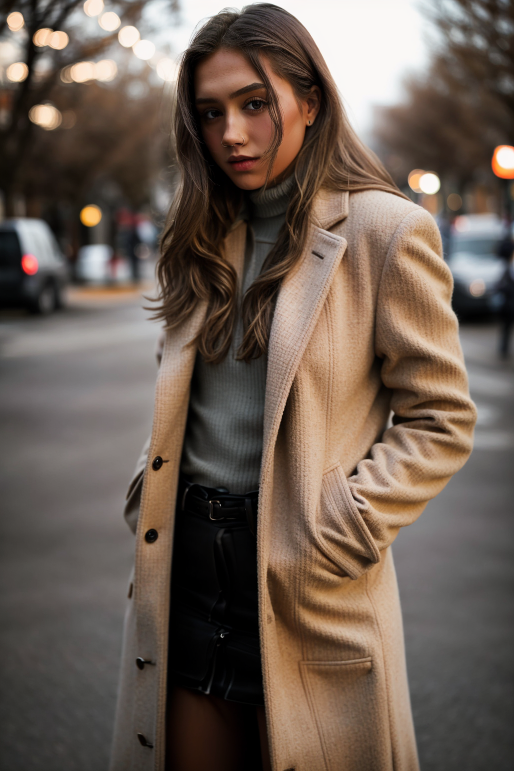 photo of 1girl, Overcoat, upper body, street, soft lighting, eye level, <lora:MYM:1>