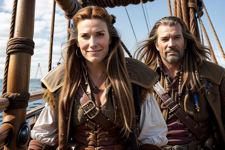 from below, on ship, action shot, dynamic angle , (medium closeup), depth of field, woman captain hanging on rigging, swinging on rope, solo, holding a sword in her hand by the hilt, wearing a tricorn with feather, jacket, dress, slender, big breasts, belt, bandolier with 2 pistols in it, n3wp1r4t3