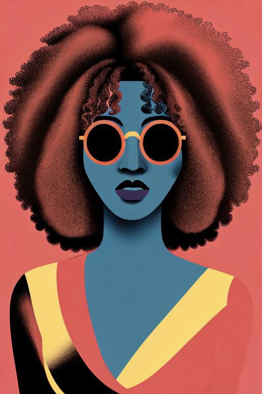 Solo focus, minimalism, simple colors, Illustration of a sexy disco dancer from 1970, glasses. lipstick, big breasts, cleavage, rainbow dress, afro hair, simple background, <lora:colorful_minimalist_illustration:1.1>