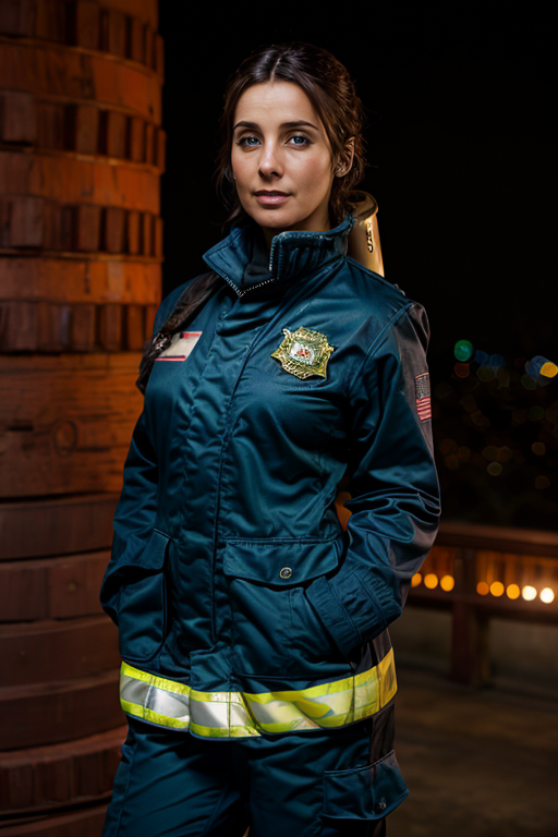 firefighter costume , observatory , dusk <lora:Louise_Redknapp:1> mature l1873r, 1girl, solo, masterpiece, best quality, detailed face,