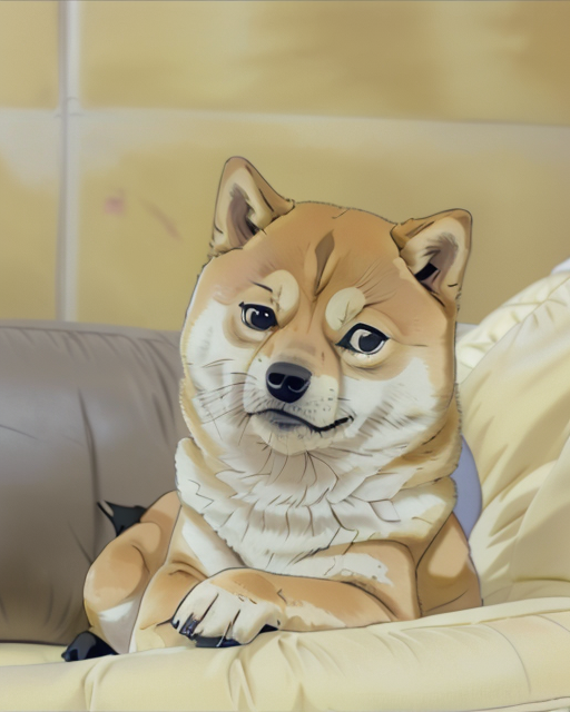 closeup portrait of a Shiba doge ,indoors in a lounge sitting onthe yellow couch <lora:NEOTOKIO_V0.01:.95> <lora:Doge_mnty_merge60_30:.8>