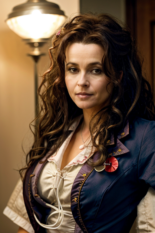<lora:Helena_Bonham_Carter:1> 1woman, solo, mature hb1873c, , brown_hair, wavy hair, messy hair, nurse costume , stream , evening
