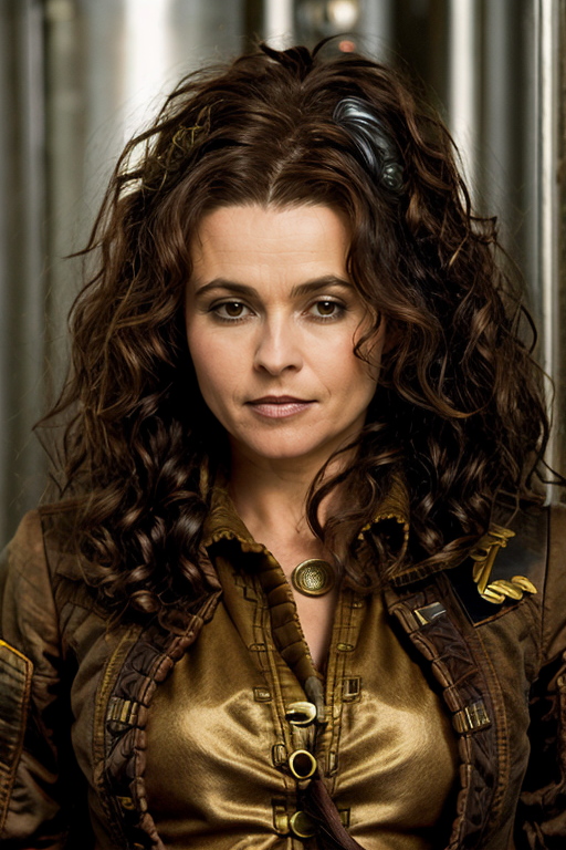 <lora:Helena_Bonham_Carter:1> 1woman, solo, mature hb1873c, , brown_hair, wavy hair, messy hair, captain costume , nuclear powerplant , evening