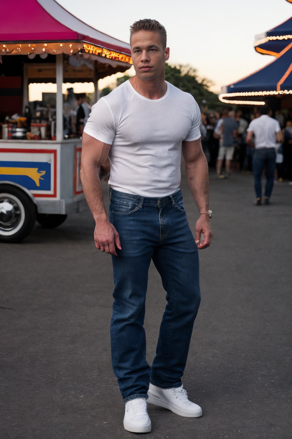 RAW Photo, full body shot photo of man matthew_rush posing in shirt and blue jeans and white sneakers standing at a carnival during the day <lora:matthew_rush-03:1>, 8k uhd, dslr, soft lighting, high quality, film grain, Fujifilm XT3*